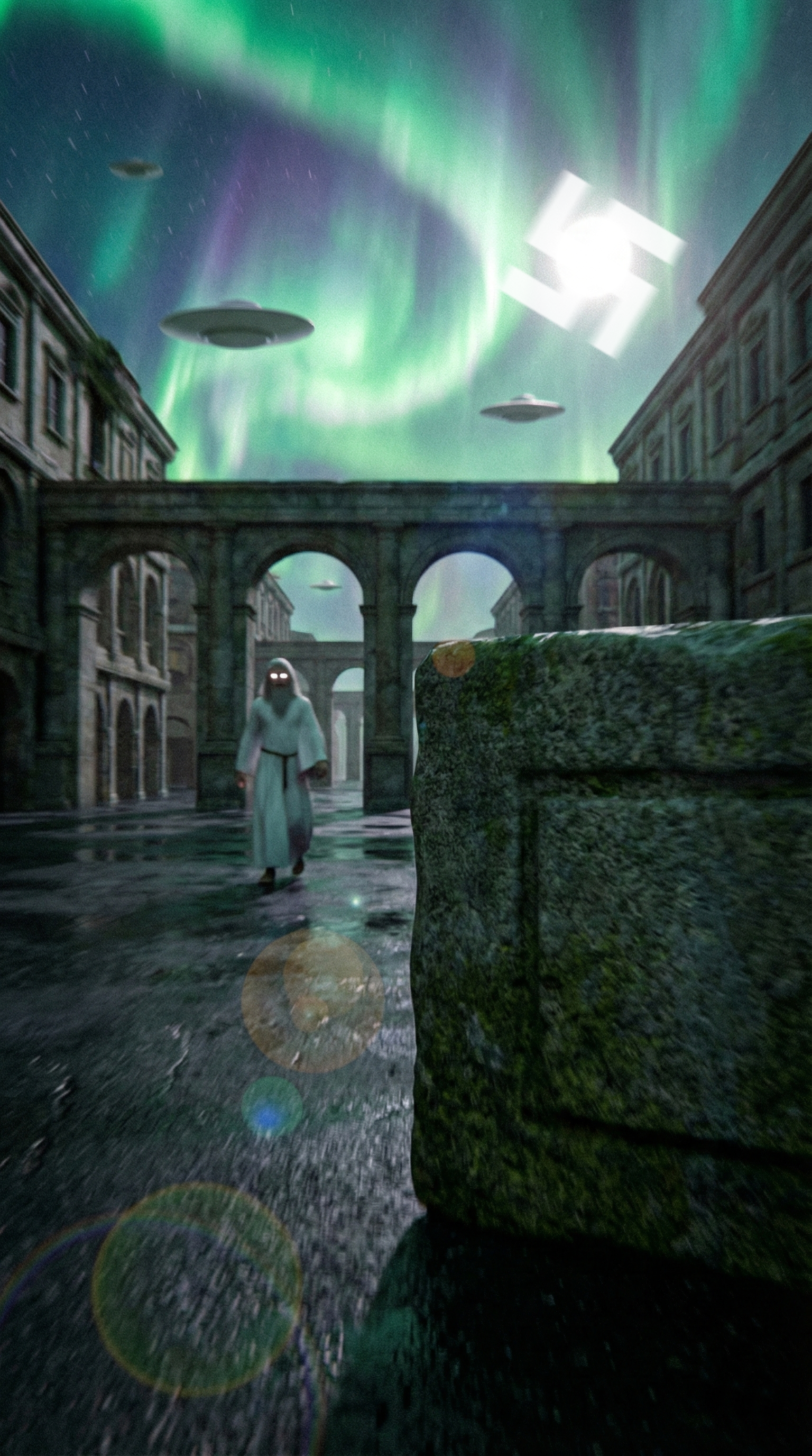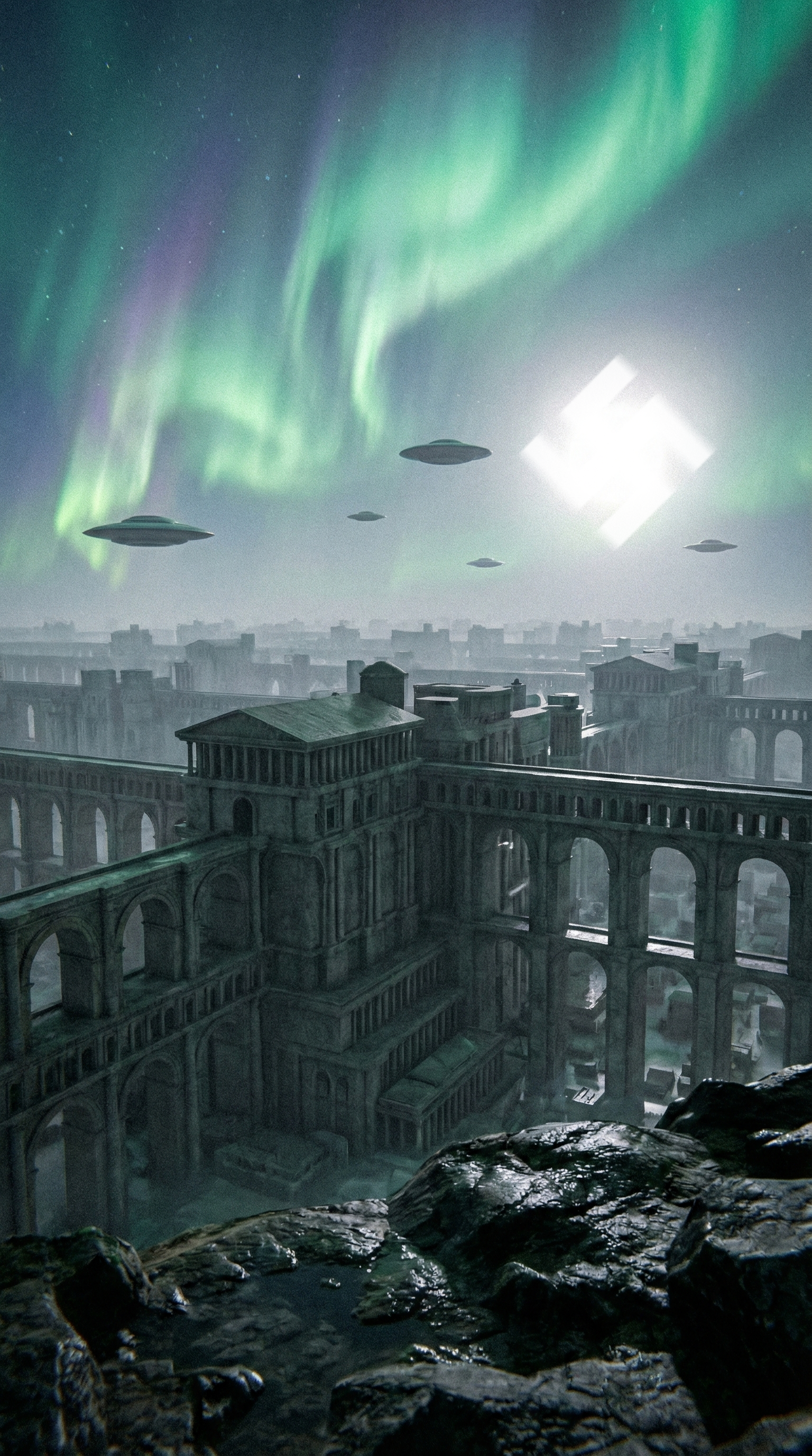 Las imágenes, supuestamente tomadas con un “iPhone 17 Pro Max ‘Titanium Ultra'”, muestran una ciudad de proporciones gigantescas, con una arquitectura que evoca el Imperio Romano, extendiéndose hasta un horizonte brumoso bajo un cielo de auroras boreales y ovnis planos, tecnología que se rumorea ser Nazi. Los detalles de las estructuras, borrosas por el movimiento y la supuesta “Tabula Rasa”, revelan una civilización avanzada y armoniosa.